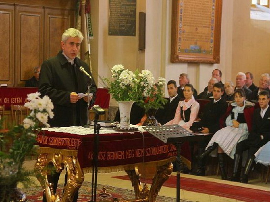 Az istentiszteletet követően Bányai József ügyvéd ismertette a hóstáti emlékszobák kialakításának előzményeit, majd Magdó János főkonzul köszöntő beszéde hangzott el. A főkonzul Napóleont említette, aki megkérdezte külügyminiszterétől, hogy mit tegyen a magyarokkal. A külügyminiszter tanácsa pedig úgy hangzott, hogy vegye el egy nép múltját, és akkor azt tehet azzal a néppel, amit akar. Magdó János szerint a történelem utólag bizonyította, hogy ennek az elméletnek később is voltak követői bőven, többek között a kommunista rendszer idején, amikor a hóstátiaktól is elvették földjeiket, házaikat. Ez a közösség azonban értékmegőrző, hagyományápoló közösség volt mindég, élte a maga életét, beilleszkedve a város mindennapjaiba. A mai generáció dolga az építkezés, olyan világ megteremtése, amelyben a közösség meg tud maradni magyarnak. Ez a szép szó – földész – is azt igazolja, hogy a föld mellett az ész is megvan ahhoz, hogy építkezzünk és megmaradjunk – zárta beszédét a főkonzul.